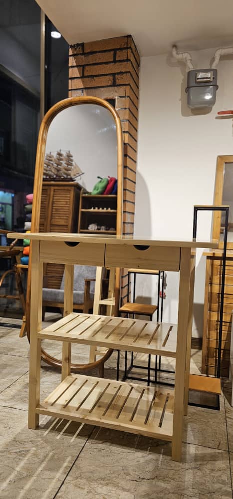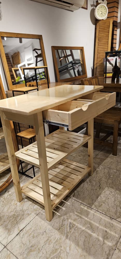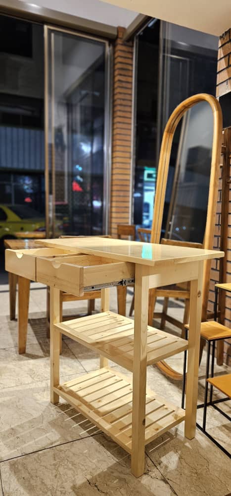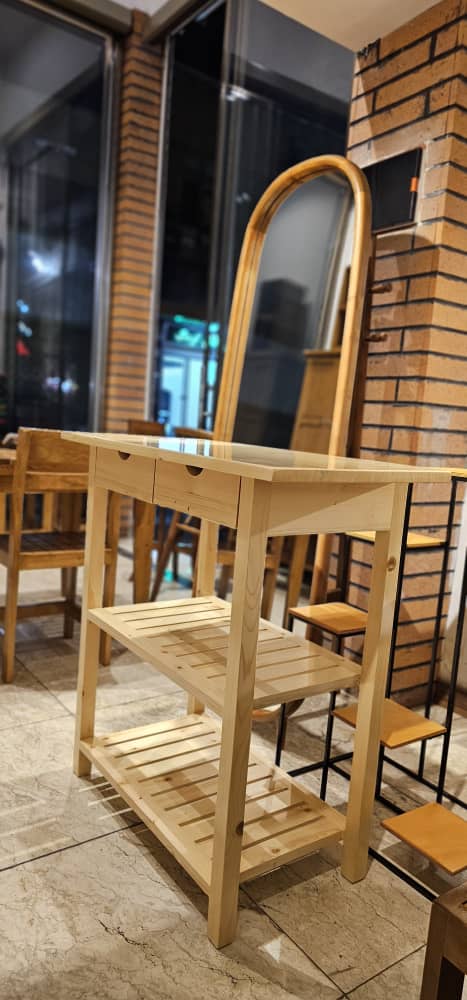 میز کافیبار چوبی با طراحی ساده و کاربردی، ساختهشده از چوب طبیعی روسی نراد (یولکا). دارای دو کشو و دو طبقه جادار برای نگهداری وسایل، مناسب برای آشپزخانه، کافه یا فضای پذیرایی با ظاهری گرم و طبیعی.